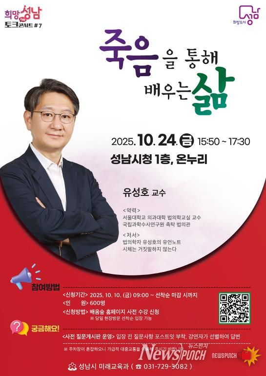 뉴스펀치 탁상훈 기자 | 성남시는 법의학자인 유성호 서울대 교수를 초빙해 오는 10월 24일 오후 3시 50분 시청 1층 온누리에서 ‘희망성남 토크콘서트 7강’을 연다.