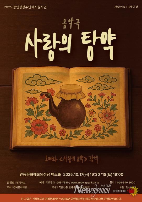 올해 선정된 상주단체 ‘극단안동’은 한국적 소재를 바탕으로 연극과 뮤지컬, 음악극, 거리 퍼포먼스 등 다양한 장르를 넘나들며 활발한 창작 활동을 이어가고 있다. 창작 음악극 '사랑의 탕약'은 10월 17일 오후 7시 30분과 18일 오후 7시, 양일에 걸쳐 안동문화예술의전당 백조홀 무대에서 열린다.