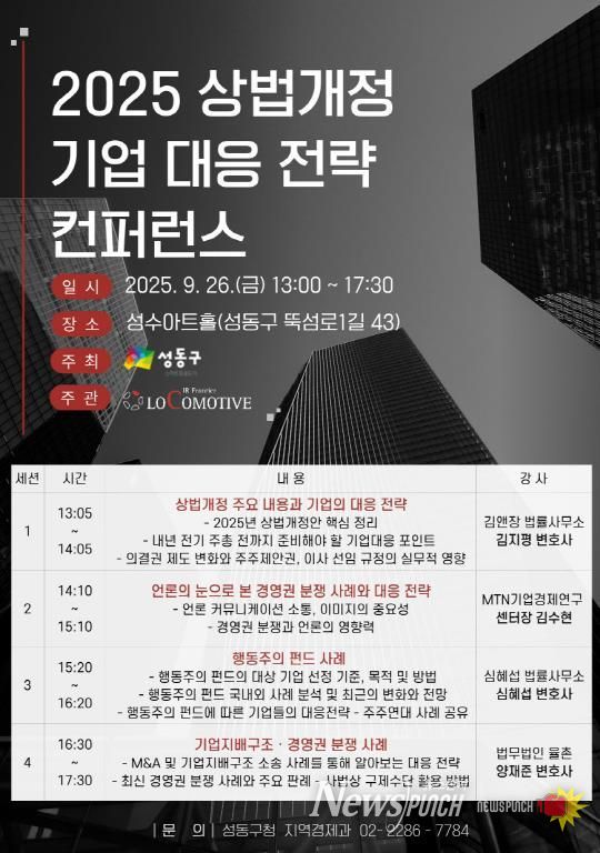 뉴스펀치 김완규 기자 | 서울 성동구는 지난달 26일 성수타운매니지먼트(Seongsu Town Management) 사업의 일환으로 진행된 '2025 상법개정과 기업의 대응전략' 컨퍼런스를 성공적으로 마쳤다고 밝혔다.