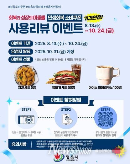 참여 방법은 간단하다. 정읍시민이라면 누구나 소비쿠폰 사용 매장에서 결제 후 인증샷을 찍고, 개인 SNS(블로그·인스타그램·페이스북·카카오스토리·카카오톡 채널 등)에 ‘#정읍소비쿠폰’ 해시태그와 함께 사용 후기를 올리면 된다. 이후 네이버폼에 게시물 링크와 정보를 입력하면 응모가 완료된다.