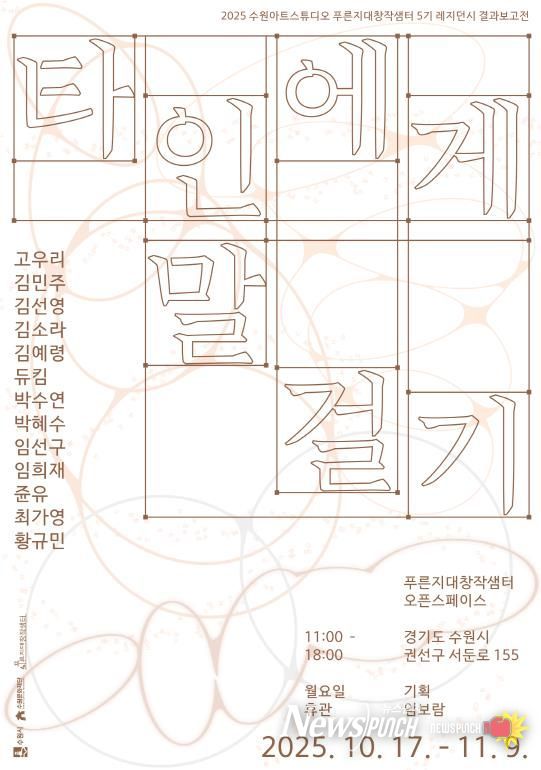 뉴스펀치 탁상훈 기자 | 수원문화재단은 오는 10월 17일부터 11월 9일까지 약 3주간 탑동 시민농장에 자리한 수원아트스튜디오 푸른지대창작샘터에서 5기 레지던시 참여작가 13인의 올 한 해 작품 활동 성과를 공유하는 결과보고전 '타인에게 말 걸기'를 개최한다.
