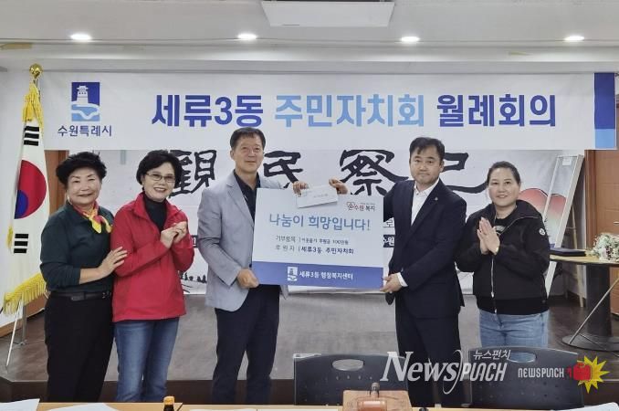 뉴스펀치 탁상훈 기자 | 수원시 권선구 세류3동 주민자치회는 지난 10월 1일, 세류3동 행정복지센터에 방문해 추석 명절 세류3동 불우이웃을 위한 100만원 후원금을 전달했다.