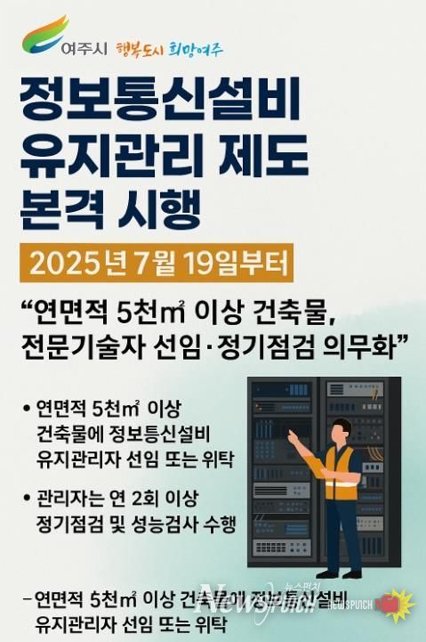 뉴스펀치 탁상훈 기자 | 여주시는 지난 7월 19일부터 ‘정보통신설비 유지보수 ‧ 관리제도’를 본격 시행하고있다고 밝혔다. 이번 제도는 일정 규모 이상의 건축물에서 통신설비가 노후되거나 방치돼 시민 불편이 발생하는 사례를 예방하기 위해 마련된 것으로, 통신설비의 체계적 관리와 안전 강화를 목표로 하고 있다.
