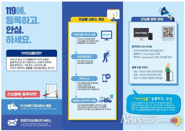 ‘119안심콜서비스’는 고령자, 장애인, 병력질환자 등 위급상황에 취약한 시민이 정보를 미리 등록해 119에 신고가 접수되는 즉시 구급대원이 해당 정보를 확인할 수 있는 제도다. 이를 통해 환자의 특이질환, 복용 약물, 보호자 연락처 등을 사전에 파악해 보다 안전하고 신속한 구급서비스를 제공받을 수 있다.