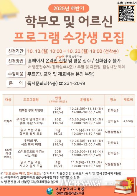 어르신 대상으로는 ▲시조를 이해하고 창작해 보는 ‘우리의 멋, 시조 창작 여행, 스마트폰 카메라 활용법’, ▲사진 편집 방법을 익힐 수 있는 ‘스마트폰으로 배우는 사진 기술’ 프로그램을 운영한다. 또한, ▲학부모 및 어르신 대상 자율 선정한 인문도서를 필사하는 ‘읽고 쓰는 여유, 필사 모임’을 진행한다.