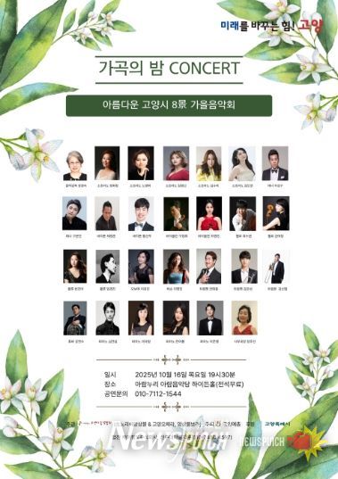 뉴스펀치 탁상훈 기자 | 고양특례시가 후원하고, (사)한국예술문화단체총연합회 고양지회가 주최하며 (사)한국음악협회 고양지부가 주관하는 ‘2025 가곡의 밤 – 아름다운 고양시 8경(景) 가을 음악회’가 오는 16일 오후 7시 30분, 고양아람누리 아람음악당에서 개최된다.