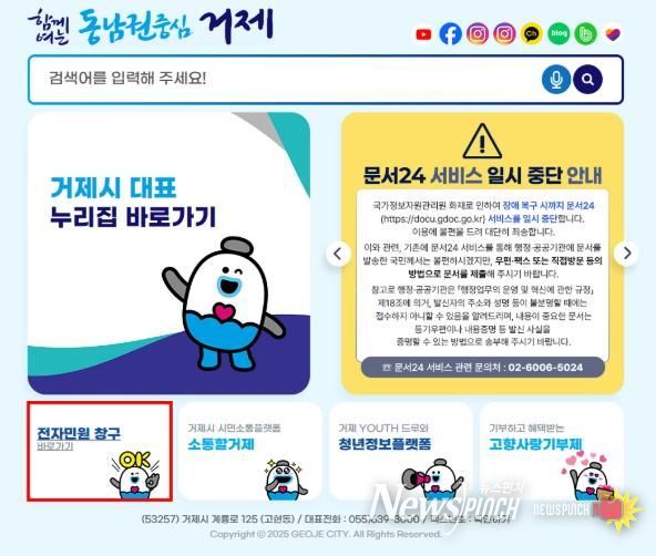 뉴스펀치 김길룡 기자 | 거제시는 국가전산망 화재로 인한 국민신문고 시스템 장애로 시민 불편을 줄이기 위해 10월 13일부터 ‘새올전자민원창구’를 임시 운영한다고 밝혔다.
