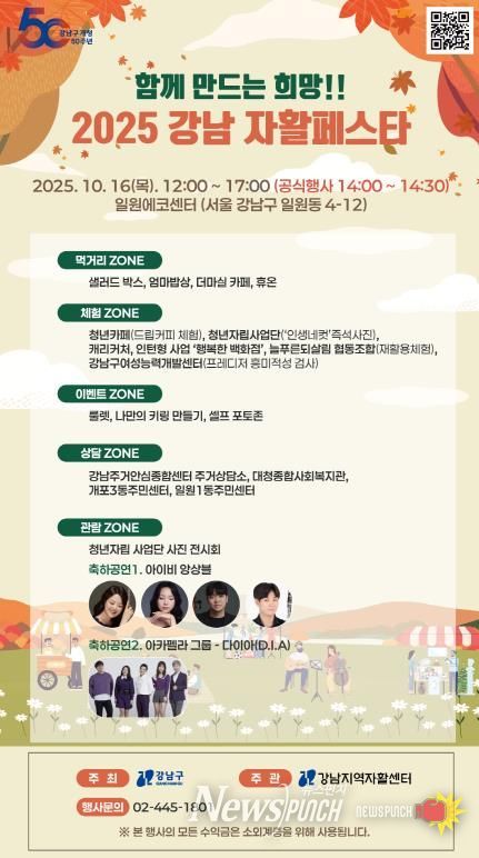 뉴스펀치 김완규 기자 | 꿈이 모이는 도시, 미래를 그리는 강남구가 10월 16일 낮 12시부터 오후 5시까지 일원에코센터에서 ‘2025 강남 자활페스타’를 개최한다.