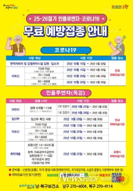 뉴스펀치 김길룡 기자 | 포항시는 오는 15일부터 2025~2026절기 고위험군 대상 코로나19 예방접종을 실시한다고 밝혔다.