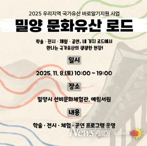 뉴스펀치 김길룡 기자 | 밀양문화관광재단은 오는 11월 8일 오전 10시부터 오후 7시까지 예림서원과 선비문화체험관 일원에서 지역 무형유산의 가치를 시민과 함께 나누는 ‘밀양 문화유산 로드’를 개최한다고 13일 밝혔다.