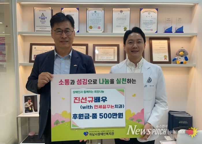 뉴스펀치 탁상훈 기자 | 하남시장애인복지관은 지난 10일, 진선규 배우가 하남시 관내 장애인 복지 증진을 위하여 후원금 200만원을 전달했다고 밝혔다. 또한 진선규 배우의 따뜻한 나눔에 공감한 꿈꾸는치과그룹(원장 주기훈)도 300만원 상당의 구강용품을 함께 기부하며 나눔에 동참했다.