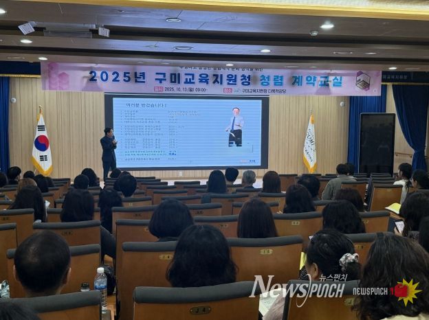 뉴스펀치 김길룡 기자 | 경상북도구미교육지원청(교육장 민병도)은 10월 13일 구미교육지원청 신청사 1층 다목적강당에서 관내 학교 계약업무 담당자를 대상으로 ‘2025년 구미교육지원청 청렴 계약교실’ 연수를 실시했다.