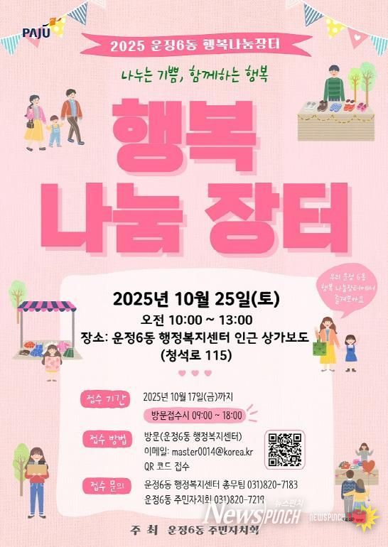 뉴스펀치 탁상훈 기자 | 파주시 운정6동 주민자치회는 오는 25일 10시부터 13시까지 운정6동 행정복지센터 앞에서 주민과 함께하는 ‘제3회 행복나눔장터’를 개최한다.