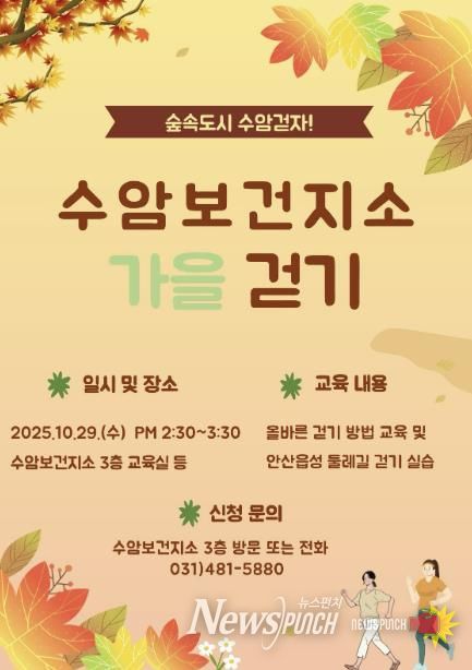뉴스펀치 탁상훈 기자 | 안산시 상록수보건소 수암보건지소는 지역 주민의 건강증진을 도모하기 위해 ‘수암 가을 걷기 교실’ 참가자를 모집한다고 14일 밝혔다.