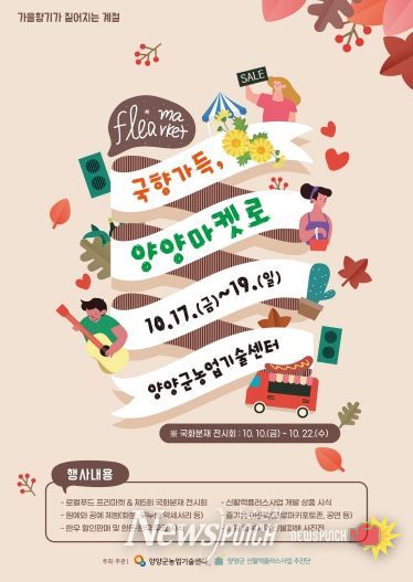 뉴스펀치 김길룡 기자 | 양양군 신활력플러스사업 추진단이 주최하고 양양군이 후원하는 ‘국향가득, 양양마켓로(路)’ 행사가 오는 10월 17일부터 19일까지 3일간, 양양군 농업기술센터 본관 앞에서 열린다.