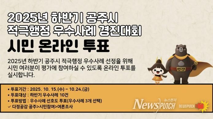 뉴스펀치 김길룡 기자 | 공주시는 올해 하반기 적극행정 우수사례 선정을 위해 시민을 대상으로 한 온라인 투표를 10월 15일부터 24일까지 실시한다고 밝혔다.