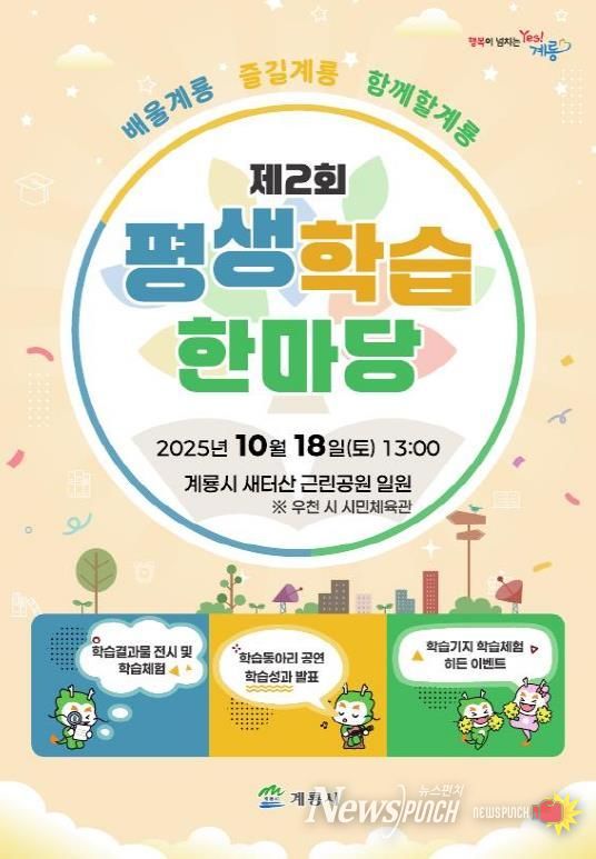 뉴스펀치 김길룡 기자 | 계룡시는 오는 18일 오후 1시부터 시청 앞 새터산 근린공원에서 시민이 주도하는 배움의 축제 “2025 제2회 계룡시 평생학습 한마당”을 개최한다고 밝혔다.