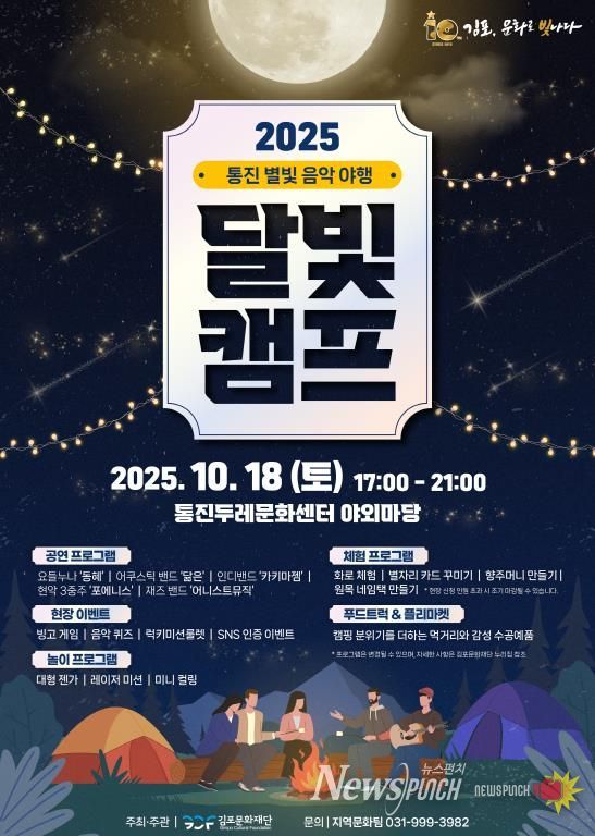 뉴스펀치 탁상훈 기자 | (재)김포문화재단이 주관하는 2025 통진별빛음악야행 '달빛캠프'가 10월 18일 17시부터 통진두레문화센터 야외마당에서 개최된다.
