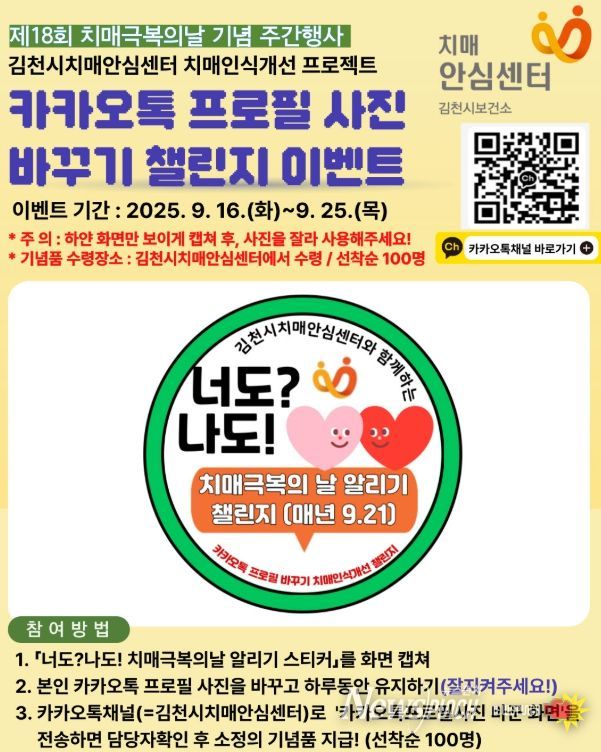 특히 ‘카카오톡 프로필 사진 바꾸기’ 챌린지 캠페인 활동에는 많은 시민이 자발적으로 참여해, 김천 전역으로 치매 인식 개선의 물결이 이어졌다.