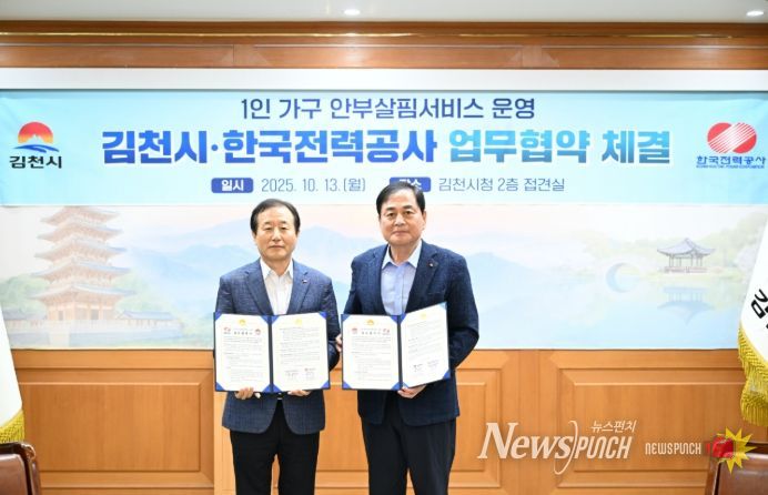 뉴스펀치 김길룡 기자 | 김천시는 지난 13일 한국전력공사 대구본부 김천지사(지사장 박용성)와 함께 ‘1인 가구 안부살핌서비스 '든든e살핌'’ 업무협약을 체결했다.