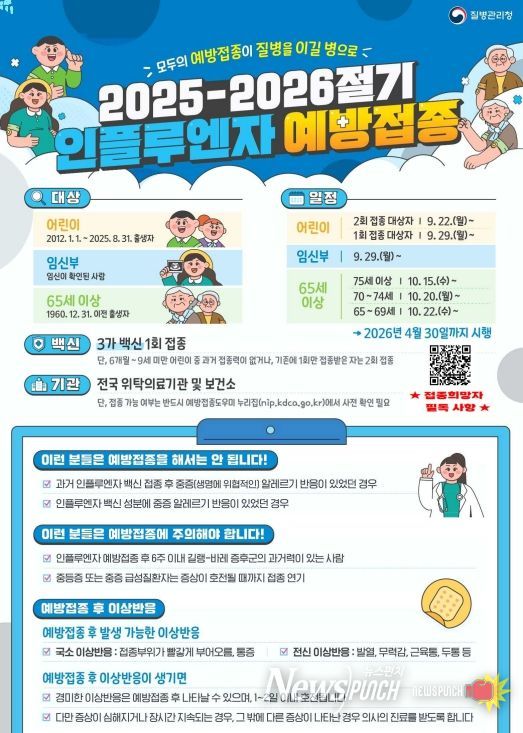 인플루엔자 국가예방접종 대상은 생후 6개월~13세 이하 어린이(2012년 1월 1일~2025년 8월 31일 출생자), 임신부, 65세 이상 어르신(1960년 12월 31일 이전 출생자)이다.