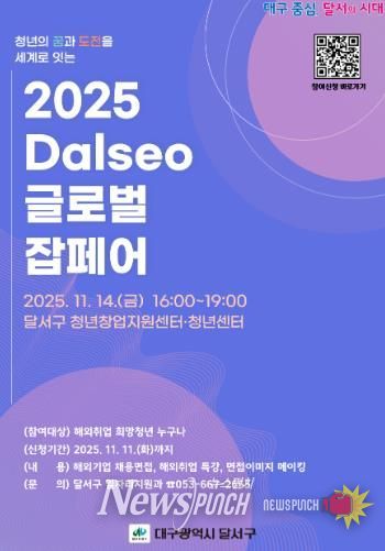 뉴스펀치 조평훈 기자 | 대구 달서구는 오는 11월 14일, 달서구 청년창업지원센터·청년센터에서 해외취업을 희망하는 청년들을 대상으로 '2025 Dalseo 글로벌 잡페어'를 개최한다.