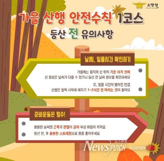 뉴스펀치 김길룡 기자 | 천안서북소방서는 본격적인 가을 산행철을 맞아 시민들에게 안전한 산행을 위한 ‘가을 산행 안전수칙’을 지켜줄 것을 당부했다.