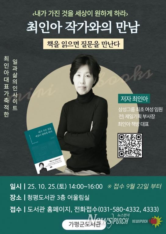 뉴스펀치 탁상훈 기자 | 가평군은 이달 25일 오후 2시 청평도서관에서 ‘2025년 정기 작가와의 만남’ 강연을 개최한다. 이번 강연은 ‘최인아 책방’ 대표로 잘 알려진 최인아 작가를 초청해 ‘책을 읽으면 질문을 만난다’를 주제로 열린다.