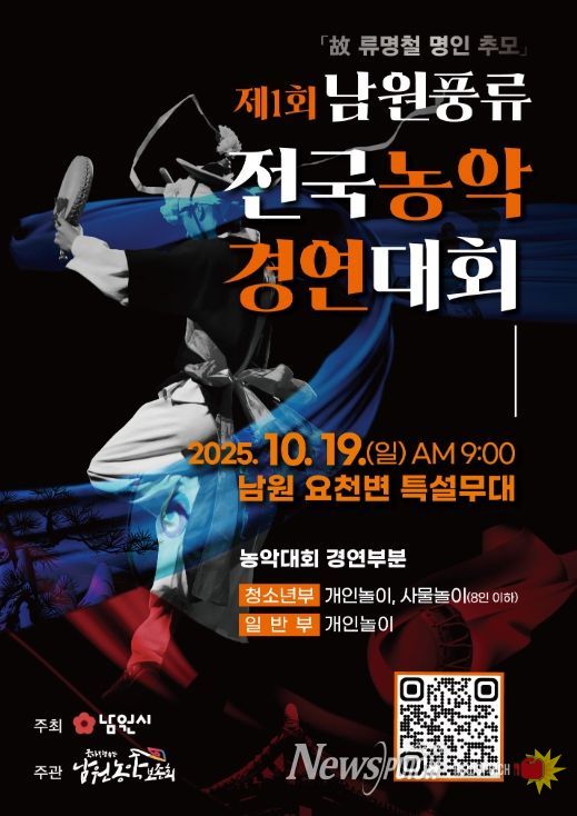 뉴스펀치 정홍균 기자 | 고(故) 류명철 명인을 추모하고 남원농악의 전통을 전국적으로 확산하기 위한 ‘제1회 남원풍류 전국농악경연대회’가 오는 10월 19일, 남원시 요천변 특설무대에서 열린다.