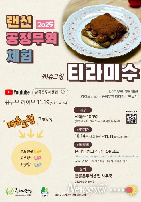 뉴스펀치 탁상훈 기자 | 인천광역시 계양구는 공정무역에 대한 구민의 관심과 참여를 높이기 위해 10월 14일부터 ‘2025 랜선 공정무역 체험(캐슈크림 티라미수 만들기)’ 참여자를 모집한다고 밝혔다.