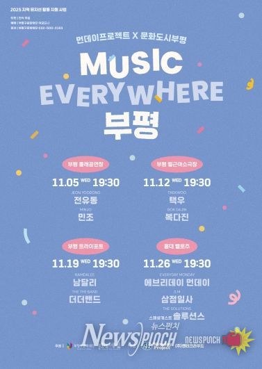 뉴스펀치 탁상훈 기자 | 부평구 문화재단 문화도시센터는 오는 11월 매주 수요일 오후 7시 30분 지역 뮤지션들의 공연 ‘MUSIC EVERYWHERE 부평’을 총 4회에 걸쳐 진행한다고 밝혔다.