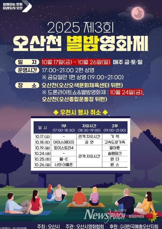 뉴스펀치 탁상훈 기자 | 오산시는 오는 10월 17일부터 26일까지 매주 금·토·일 저녁, 오산천(오색문화체육센터 뒤편)에서 시민들이 야외에서 영화를 즐길 수 있는 '2025 제3회 오산천 별밤영화제'를 개최한다고 밝혔다.
