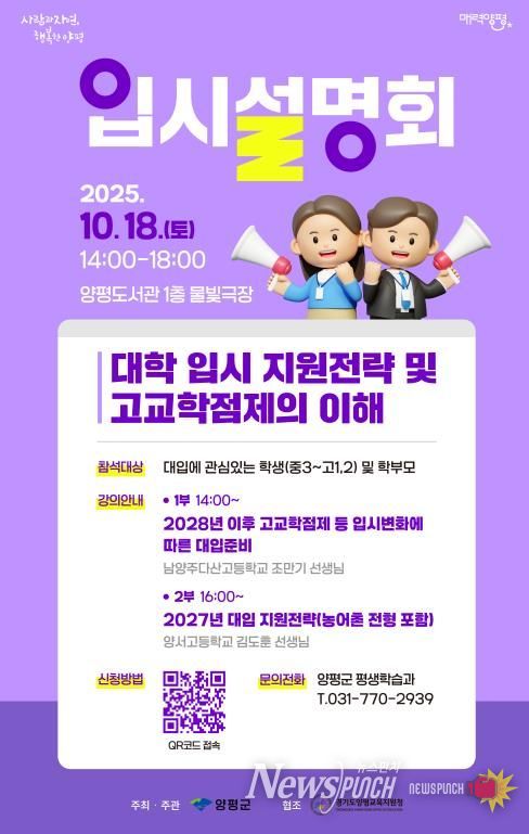 뉴스펀치 탁상훈 기자 | 양평군은 오는 10월 18일 오후 2시, 양평도서관 물빛극장에서 관내 학생과 학부모를 대상으로 ‘2025년 양평군 대학 입시설명회’를 개최한다고 밝혔다. 이번 설명회는 대학 입시에 관심 있는 학생과 학부모에게 다양한 입시 정보를 제공하기 위해 마련됐다.