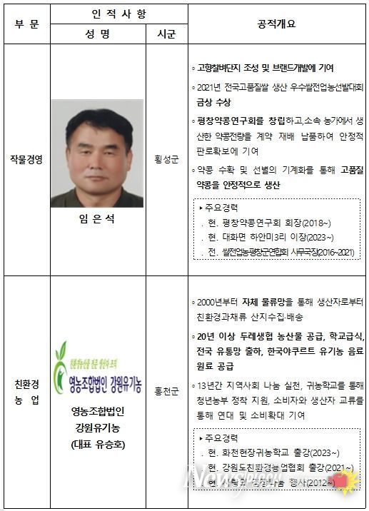 - 각 부문별 수상자는 △작물경영부문 임은석(평창) △친환경농업부문 ㈜강원유기농(대표 유승호, 홍천) △수출·유통부문 솜씨가(주)(영월) △축산발전부문 김진선(삼척) △미래농업육성부문 추경진(횡성) △농촌융복합산업부문 해담마을(대표 이병광, 양양)이다.