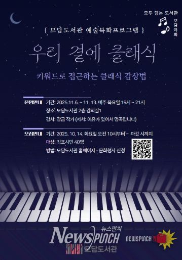 뉴스펀치 김길룡 기자 | 김포시 모담도서관은 클래식을 주제로 11월 6일부터 13일까지 매주 목요일 오후 7시부터 9시까지 특별 강연을 운영한다.