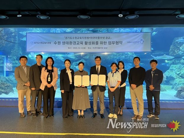 뉴스펀치 김길룡 기자 | 경기도수원교육지원청은 10월 14일, 수원 E:음 공유학교 프로그램의 다양화를 위해 경기도양궁협회 및 아쿠아플라넷 광교와 업무협약을 체결했다.