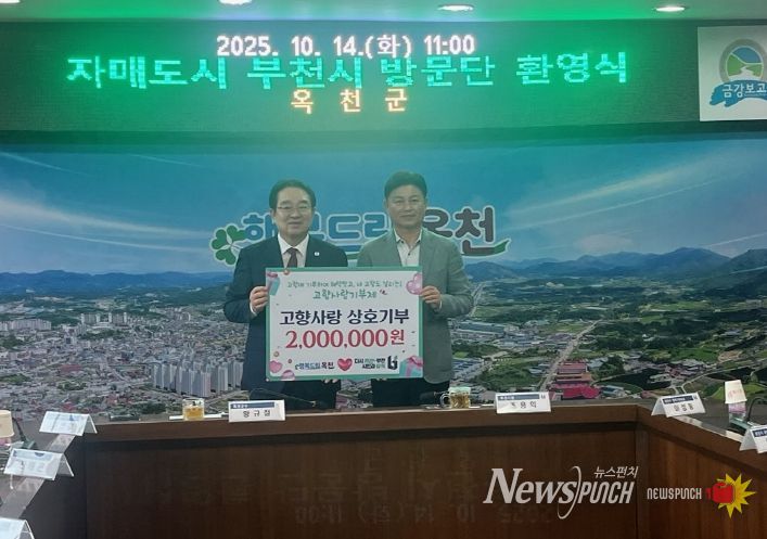뉴스펀치 김길룡 기자 | 14일, 조용익 부천시장을 비롯한 부천시 충청권 정책현장 벤치마킹 방문단 24명이 ‘향수의 고장’ 옥천군을 방문했다. 이번 만남은 2002년 자매결연을 체결한 두 지역 간의 우호 증진과 교류 확대를 위한 자리로 마련됐다. 이날 옥천군과 부천시는 각 200만 원의 고향사랑기부금을 상호 기탁하며 두 지역의 발전을 함께 응원했다.