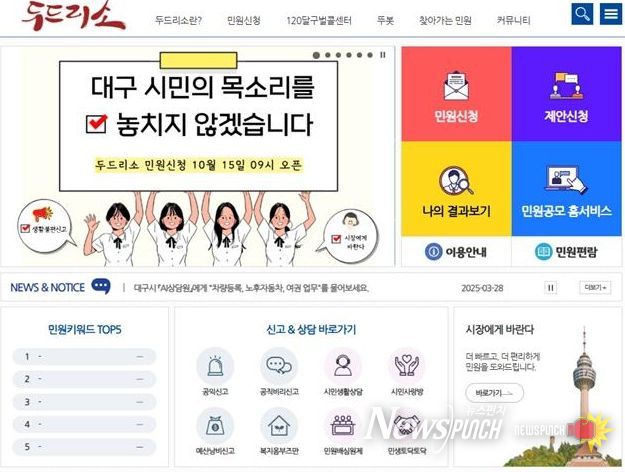 뉴스펀치 조평훈 기자 | 대구광역시는 9월 26일 발생한 국가정보자원관리원 화재로 ‘국민신문고’와 ‘안전신문고’ 민원 접수가 어려워지자, 자체 민원 시스템인 ‘두드리소’의 민원 신청 기능을 복구해 10월 15일 오전 9시부터 서비스를 재개한다.