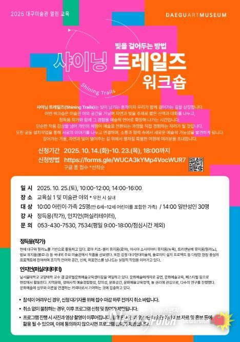 뉴스펀치 조평훈 기자 | 대구문화예술진흥원 대구미술관은 오는 10월 25일, 오전 10시, 오후 2시, 총 2회에 걸쳐 열린 교육 ‘샤이닝 트레일즈 워크숍: 빛을 걸어 두는 방법’을 운영한다.