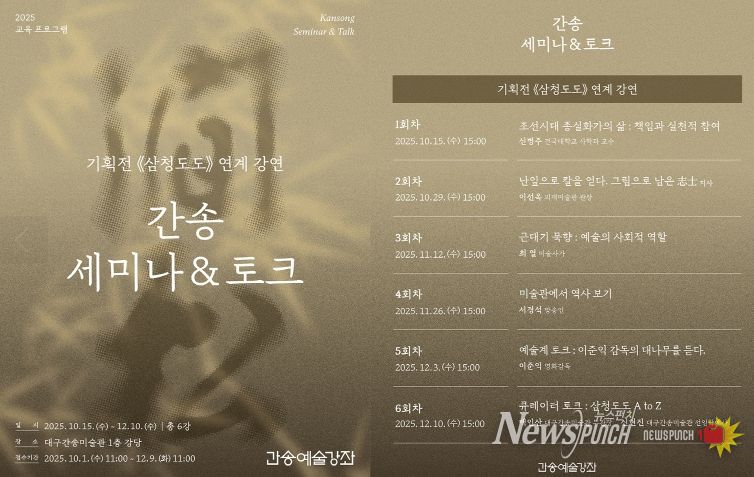 뉴스펀치 조평훈 기자 | 대구간송미술관은 광복 80주년 기념 기획전 《삼청도도 – 매·죽·난, 멈추지 않는 이야기》와 연계하여 ‘간송예술강좌: 세미나 · 토크’를 운영한다.