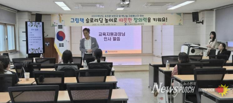 뉴스펀치 김길룡 기자 | 경상북도영양교육지원청은 2025년 10월 14일 영양교육지원청 대회의실에서 ‘그림책 슬로리딩 놀이로 따뜻한 창의력을 키워요’라는 주제로 관내 유치원, 어린이집 및 초등 1, 2학년 학생과 학부모를 대상으로 2025 유치원·초등 저학년 보호자 및 책나눔 자원봉사자 연수를 개최했다.
