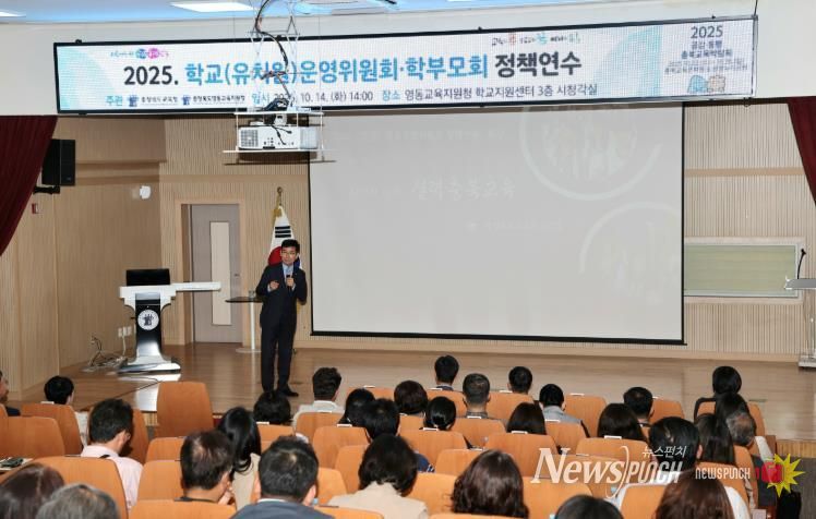 뉴스펀치 김길룡 기자 | 충청북도영동교육지원청은 14일 영동교육지원청 학교지원센터 3층 시청각실에서 관내 유·초·중·고등학교 운영위원, 학부모회 임원, 학교(원)장, 행정실장 120여 명을 대상으로 2025. 학교(유치원)운영위원회·학부모회 정책연수를 실시했다.