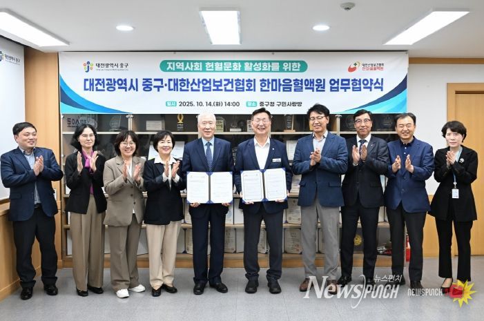 뉴스펀치 김길룡 기자 | 대전 중구는 14일 지역사회 헌혈문화 활성화를 위해 대한산업보건협회 한마음혈액원(협회장 백헌기)과 업무협약을 체결했다고 밝혔다.