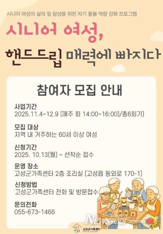 뉴스펀치 김길룡 기자 | 고성군가족센터(센터장 황순옥)는 지역 내 60세 이상 시니어 여성의 자기 돌봄 역량 강화 프로그램 『시니어 여성, 핸드드립 매력에 빠지다』의 참여자를 모집한다.