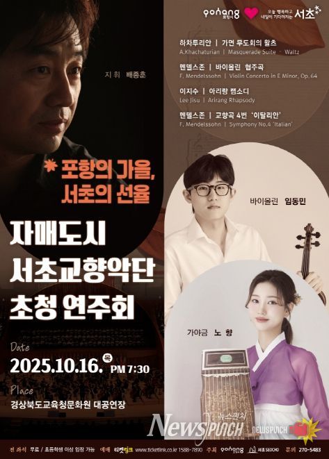 뉴스펀치 김길룡 기자 | 포항시는 오는 16일 경상북도교육청문화원 대공연장에서 자매도시인 서초교향악단을 초청해 ‘포항의 가을, 서초의 선율’ 교향악 공연을 연다고 밝혔다.