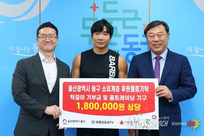 뉴스펀치 김길룡 기자 | 운동 유튜브 채널 ‘바벨라토르’(대표 이정희)가 10월 14일 오후 3시 동구청을 방문해, 지난 9월 13일 일산해수욕장 중앙광장에서 ‘턱걸이 왕중왕전’을 진행하고 모금한 기부금과 운동 물품 등 180만 원 상당을 동구에 기부했다.