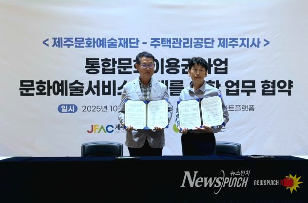 뉴스펀치 김길룡 기자 | 제주문화예술재단과 주택관리공단 제주지사는 지난 13일 통합문화이용권 사업(문화누리카드)과 연계한 문화예술 서비스 확대를 위해 업무협약을 체결했다.