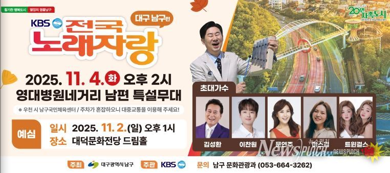 뉴스펀치 조평훈 기자 | 대구 남구는 국내 최장수 인기 프로그램인 KBS 전국 노래자랑 ‘대구 남구편’이 오는 11월 4일 오후 2시, 영대병원네거리 남편 특설무대에서 열린다고 밝혔다.