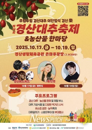 뉴스펀치 김길룡 기자 | (재)경산문화관광재단은 ‘제14회 경산대추축제 & 농산물 한마당’을 오는 17일부터 19일까지 3일간 경산생활체육공원 온마루광장(구 어귀마당)에서 개최한다.