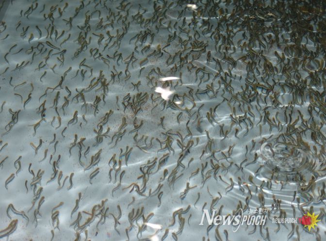 포획은 전문 어업인으로 구성된 인력 13명이 투입되어 오십천에 설치된 포획장에서 진행된다.
